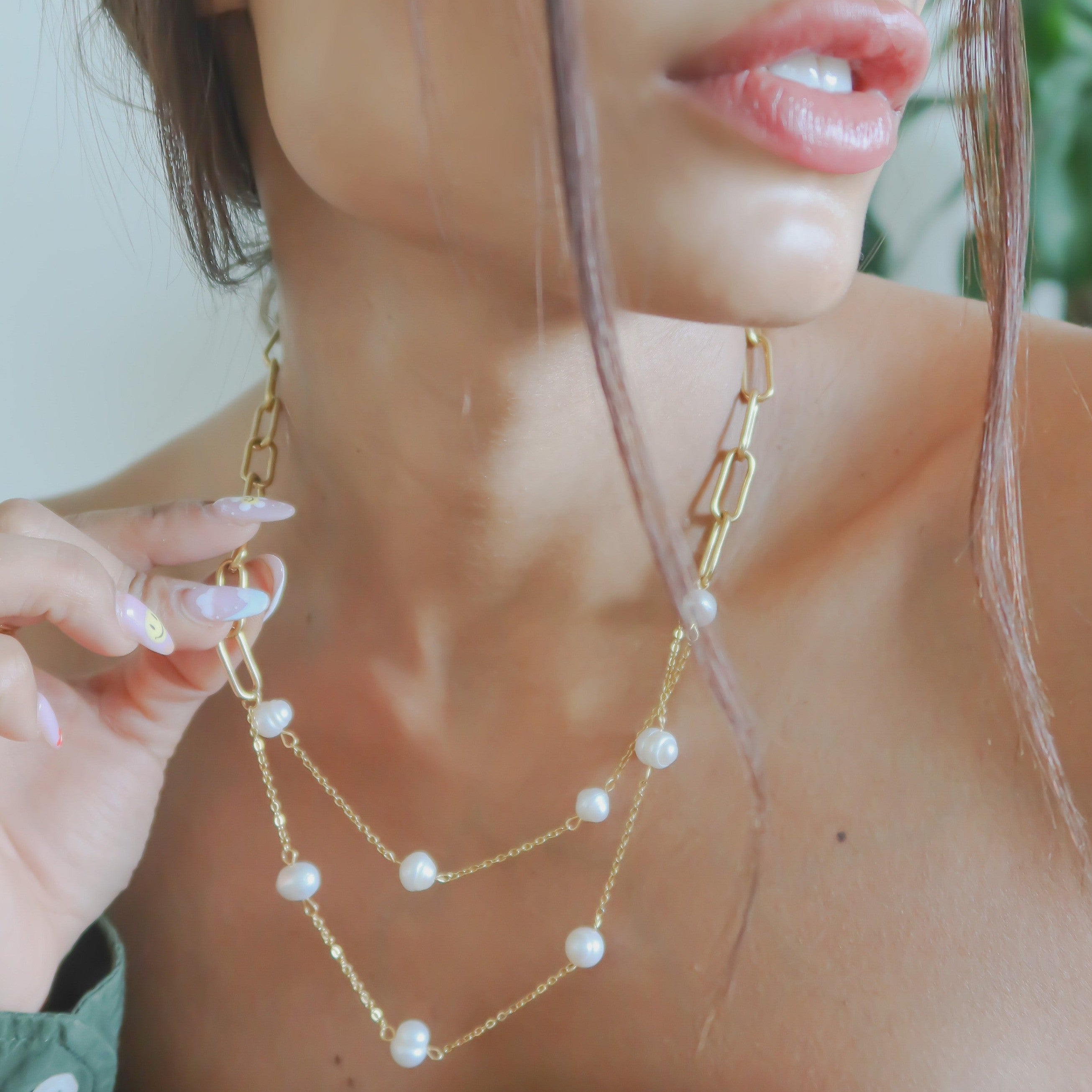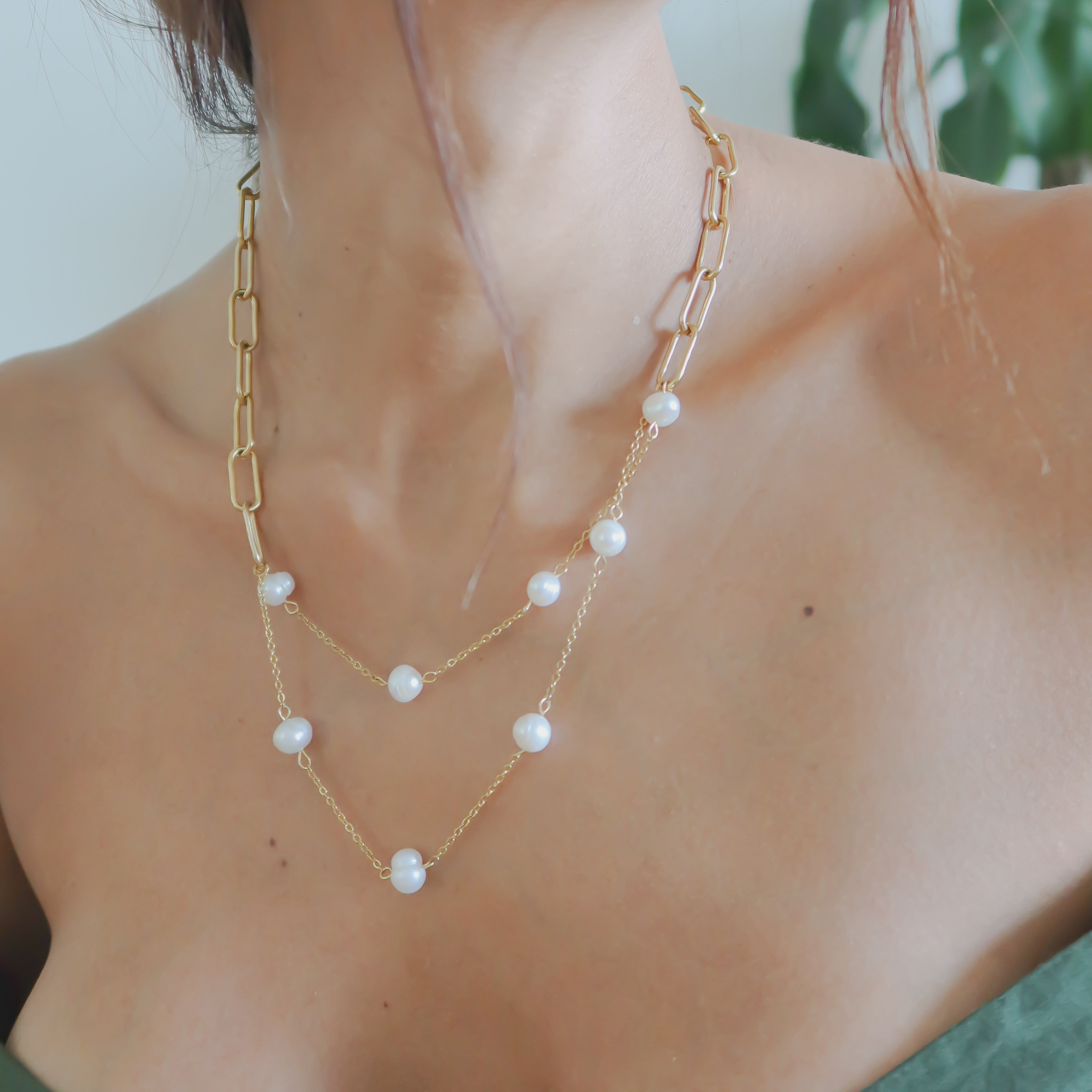 Exude elegance and sophistication with our unique pearl necklace, a stunning blend of natural freshwater pearls and a bold paper...