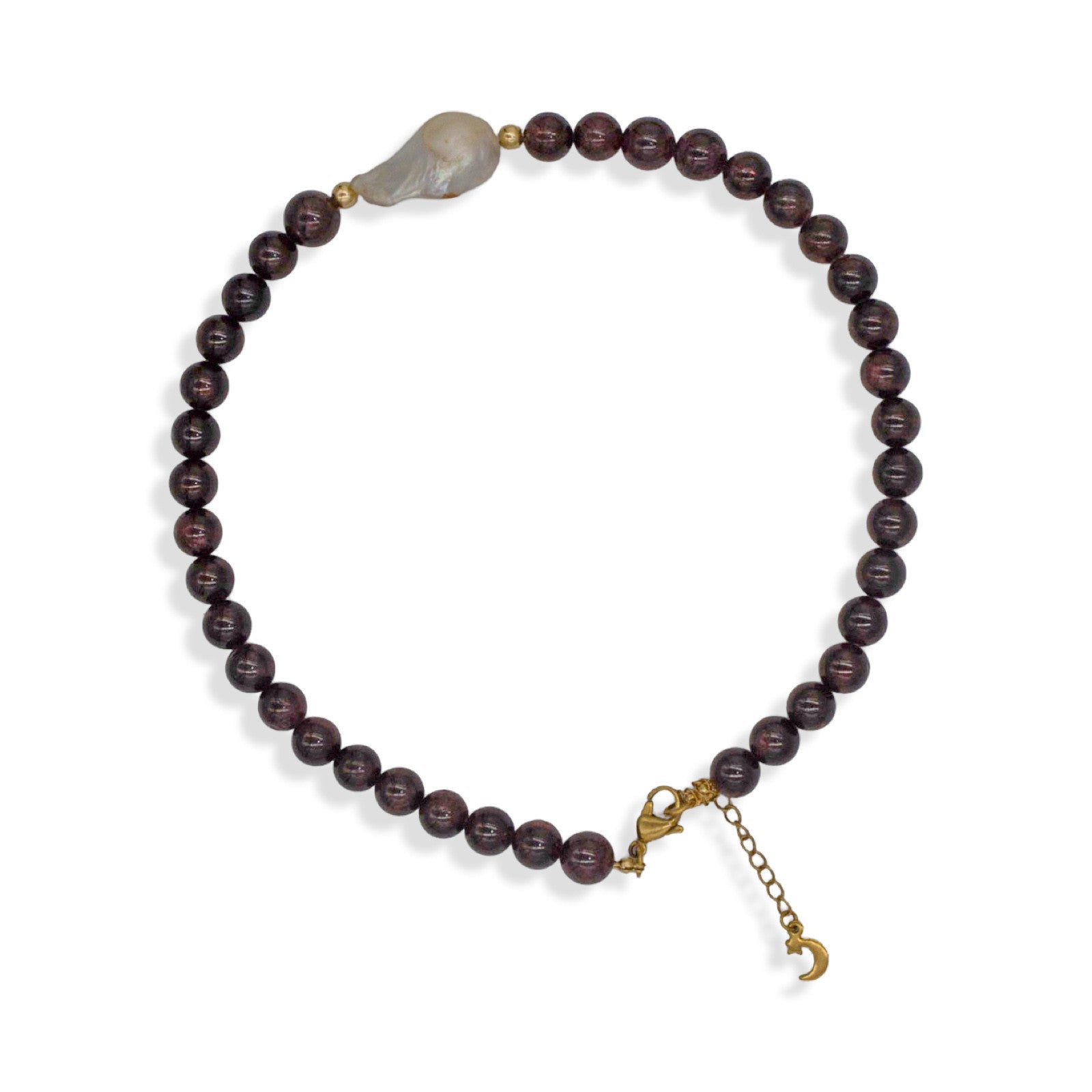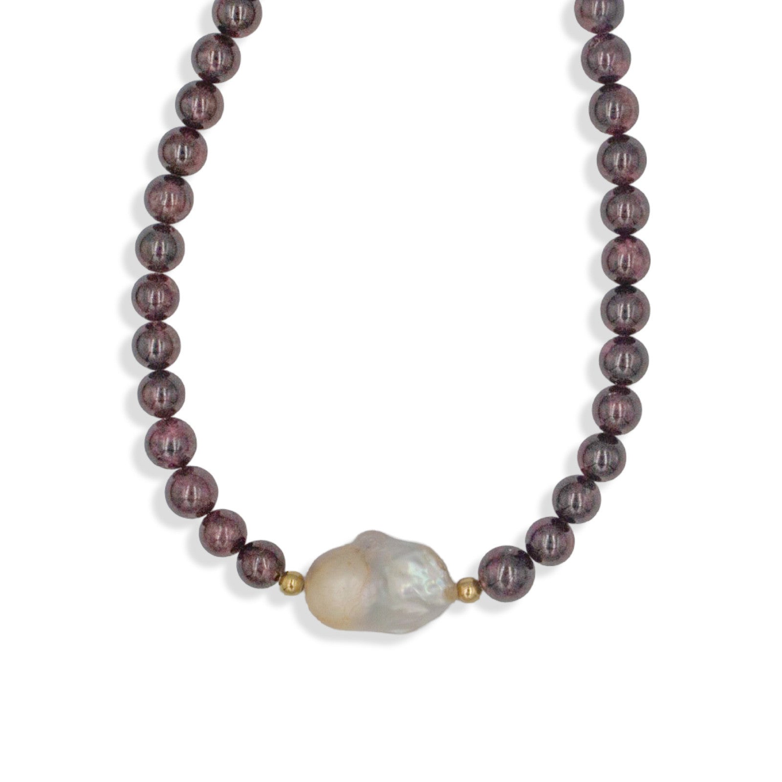 Bold, raw, and unapologetically luxe—this artisan necklace features an organic baroque pearl centerpiece surrounded by bold 10mm garnet stones, creating...