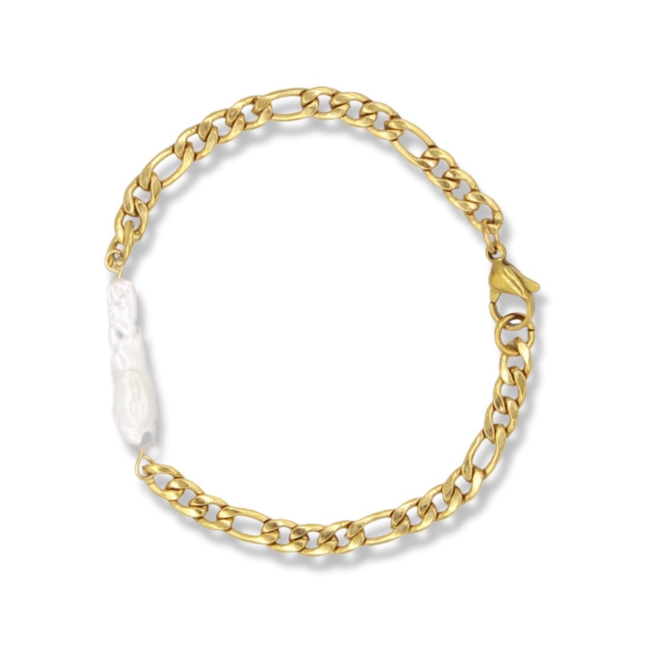 A one-of-a-kind fancy-shaped organic white freshwater pearl set on a 4.5mm classic figaro chain. Pearl Dimensions: 4x12mm Know your size? Select...