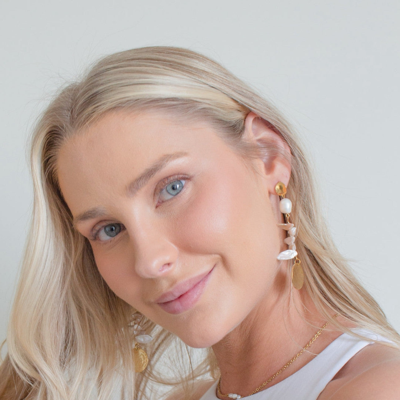 Natural 12-15 mm potatoe and fancy shaped organic baroque freshwater pearls.Hand-hammered disc: 20 mm.Total Length: 70 mm est.