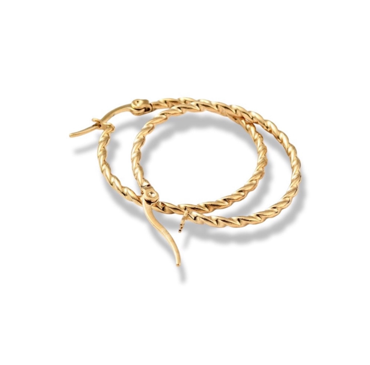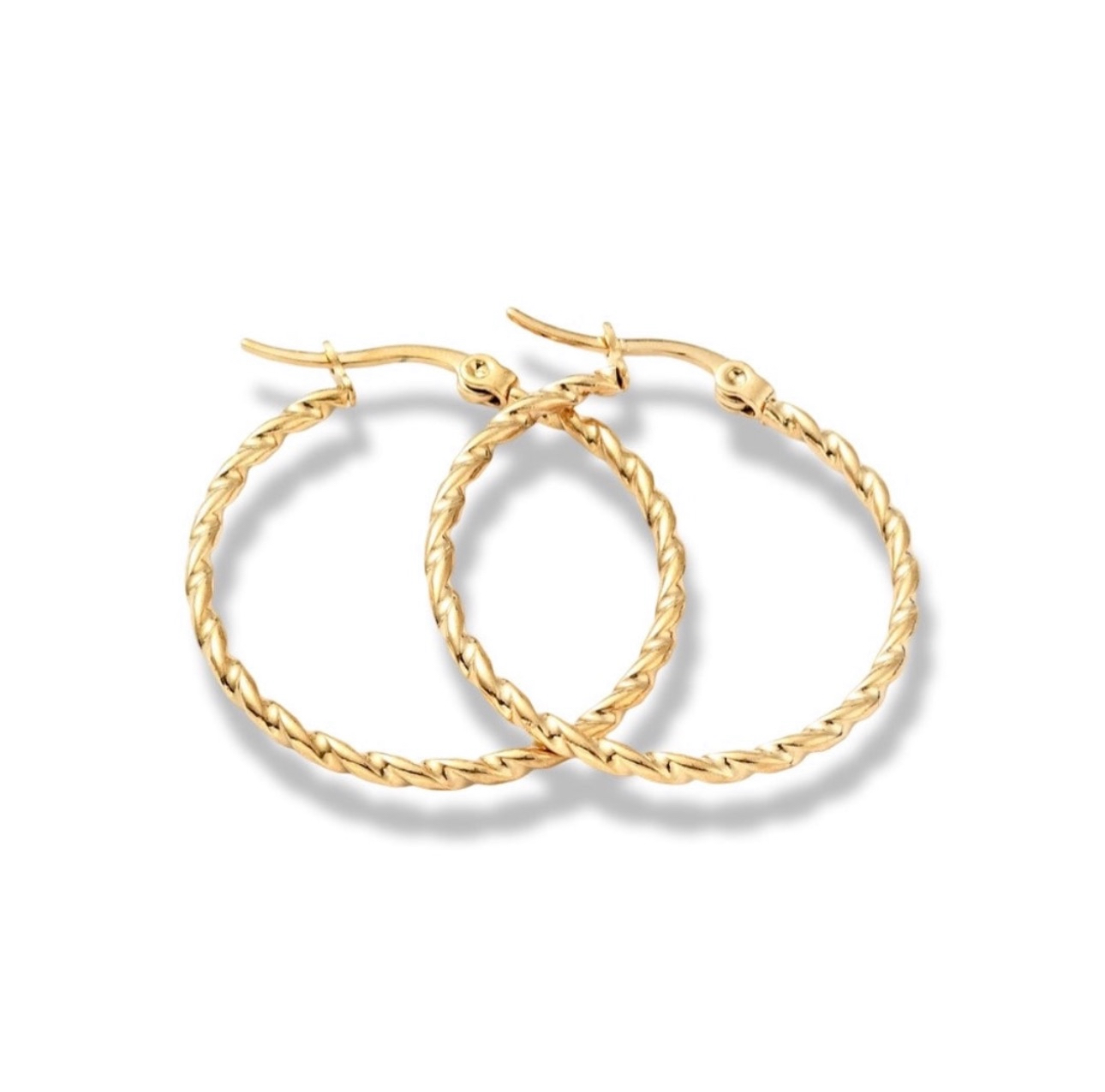 The twisted wire frame adds a visual interest and makes this pair of hoops an striking addition to your jewelry...