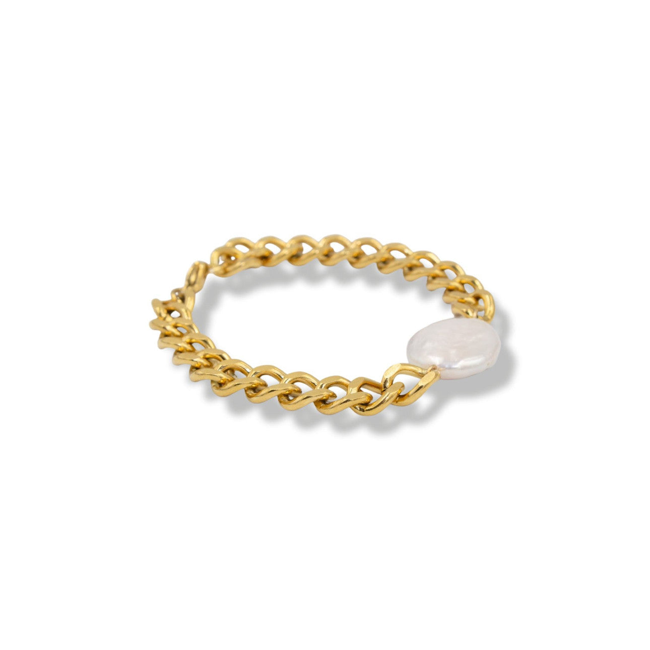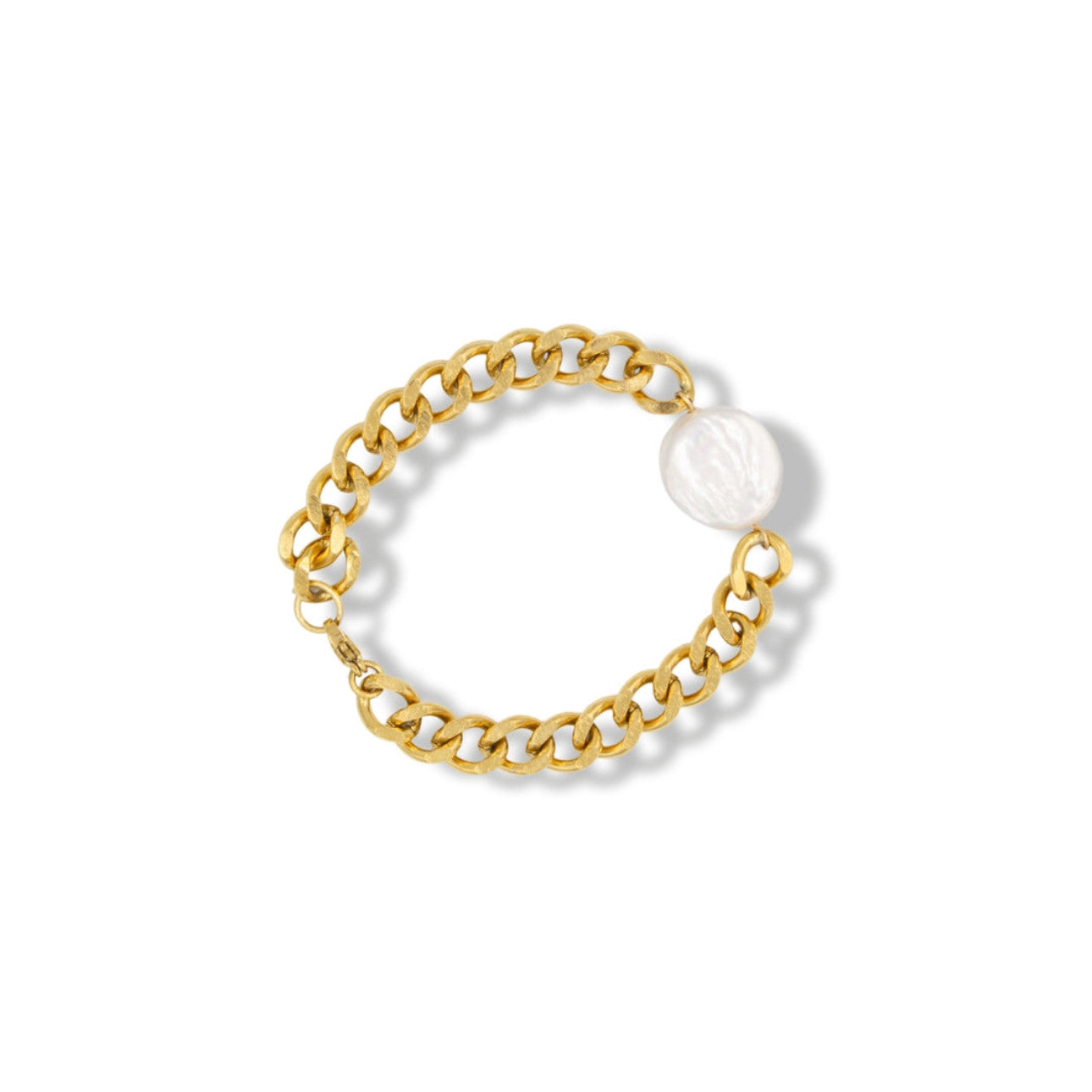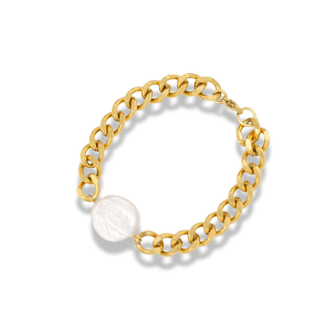 A 10-15mm flat round-shaped organic white freshwater pearl set on a 10mm bold curb chain. Know your size? Select it. Not...