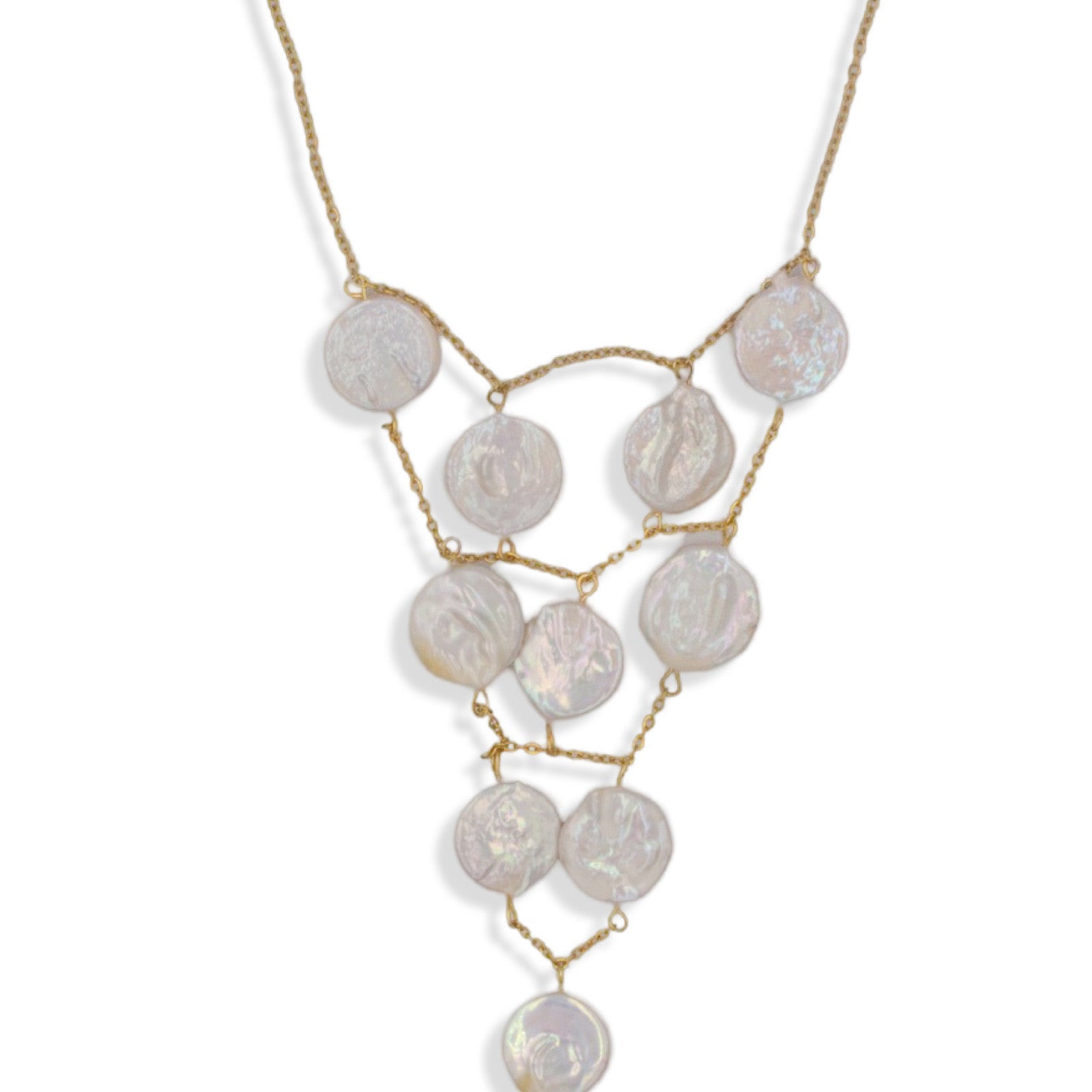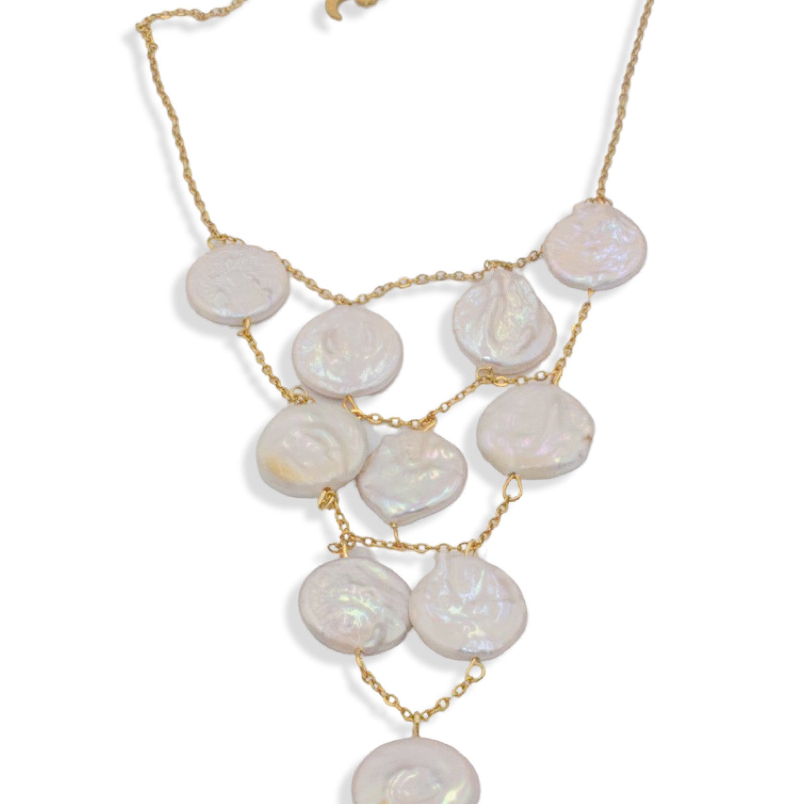 Step into the spotlight with this avant-garde freshwater pearl necklace—a bold statement of elegance and individuality. Featuring 10mm flat, iridescent...