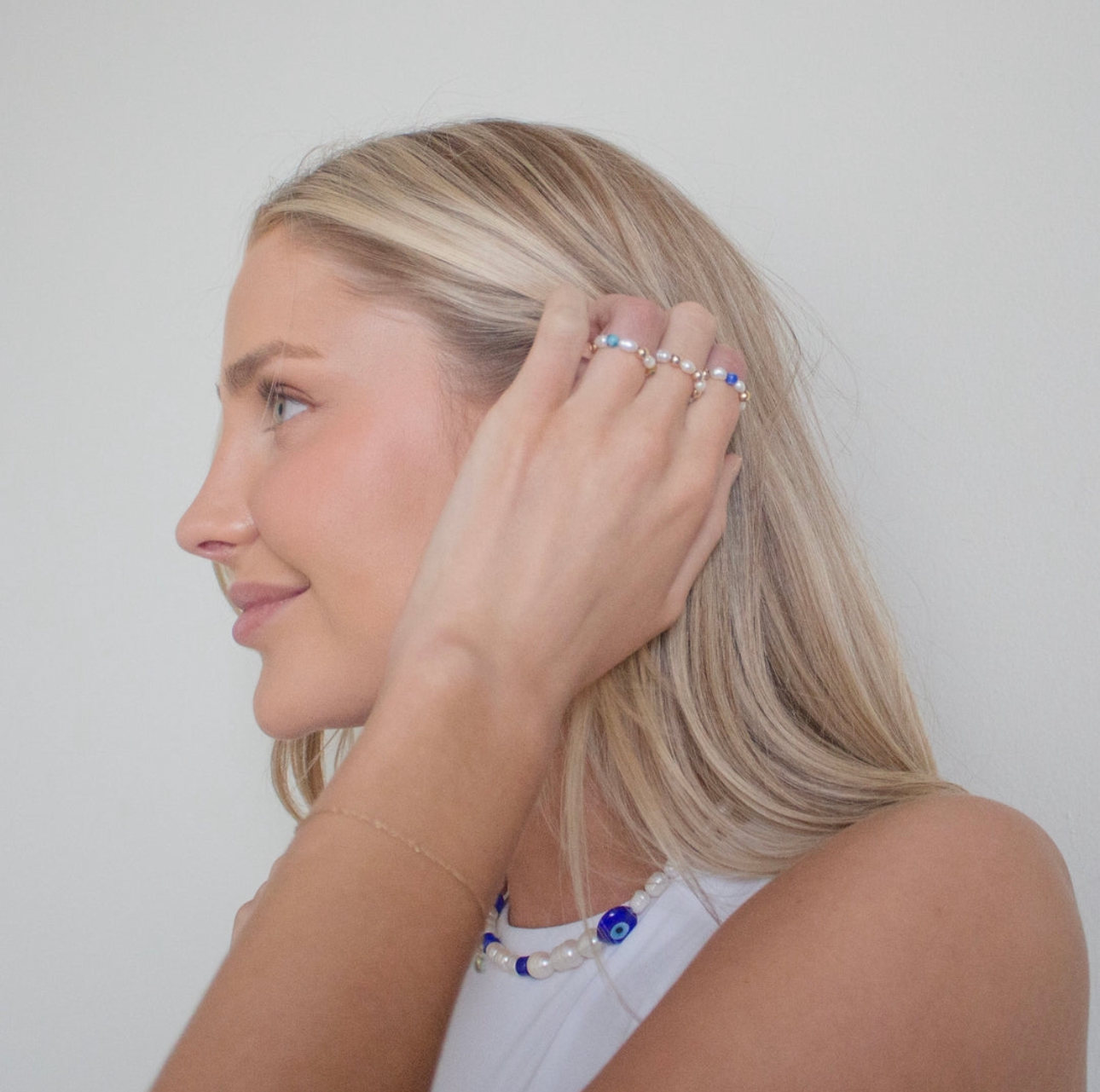 Made with 3-4mm natural freshwater white pearls and evil eye charms. Style it your way and keep the bad vibes...